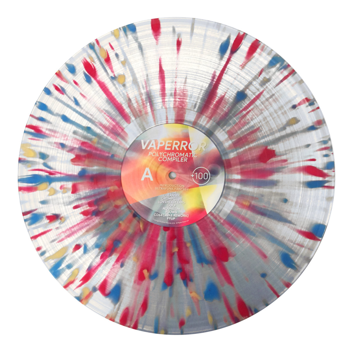 12" clear vinyl record with pink, cyan, and yellow splatter. 4mm spine. Weight is 140g +/- 10g. 33 1/3 RPM. Comes in a poly bag.